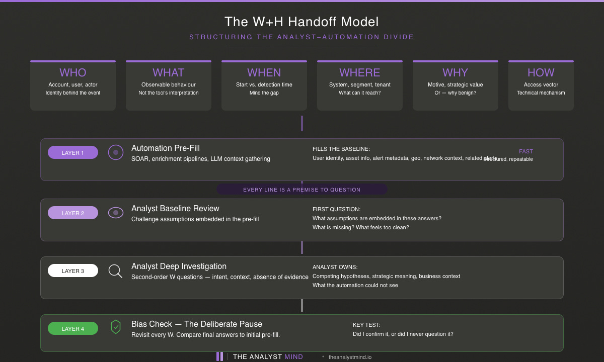 This is not a workflow diagram for a SOAR platform. It is a thinking model. The automation handles the context gathering so the analyst can focus on the cognition. That is the division of labour that actually works.